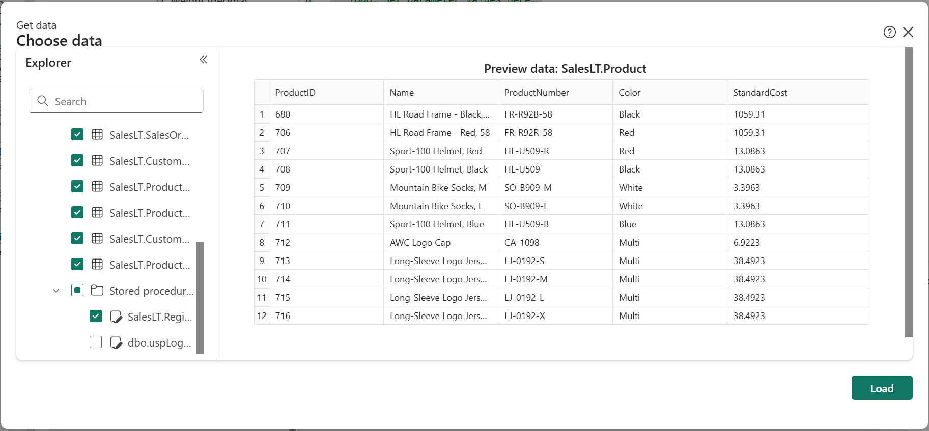 接下来,选择数据库中的 SalesLT 表和刚刚创建的存储过程,然后单击“ 加载:
