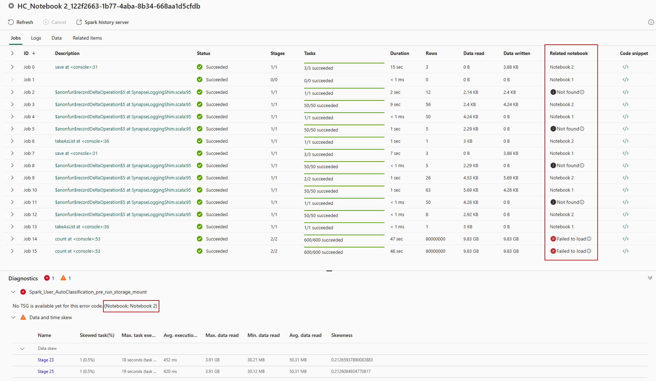 对于高并发会话,用户可以使用“相关笔记本”选项卡从不同笔记本中标识作业及其关联的日志,它还会显示运行该作业的笔记本。