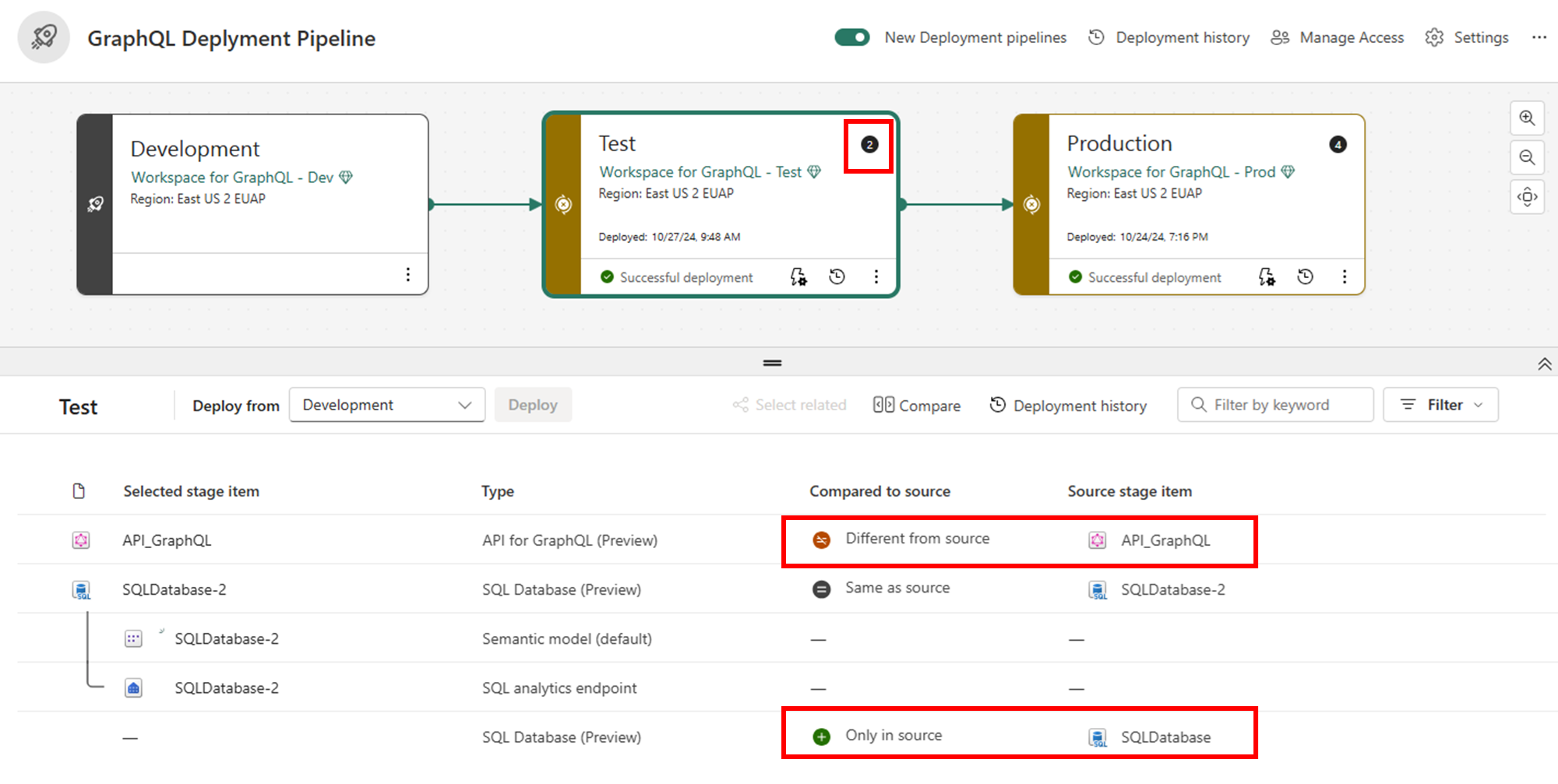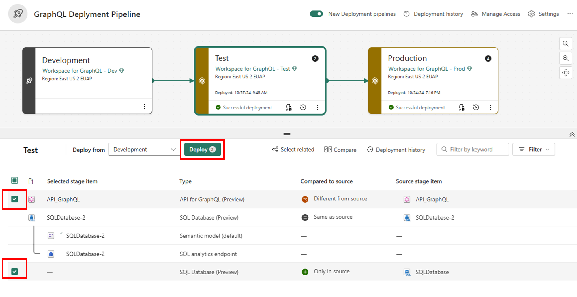 - 选择需要部署的项。 选择“ 部署 ”以跨开发、测试和生产阶段部署所选项(GraphQL 的 API 及其连接的数据源)。