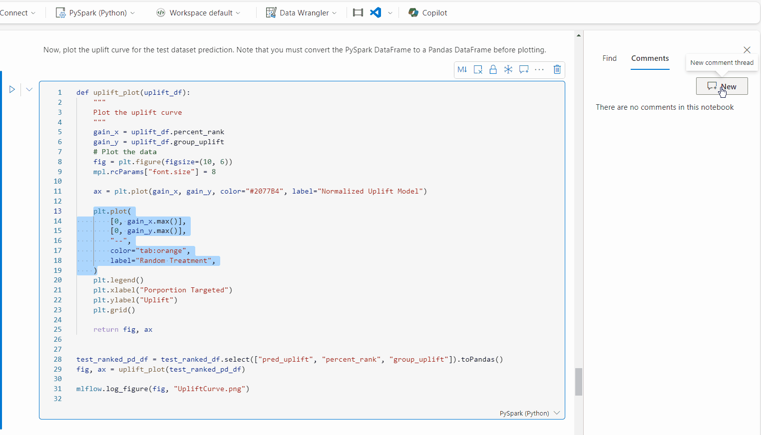 在单元格中选择一段代码并新建一个注释线程。