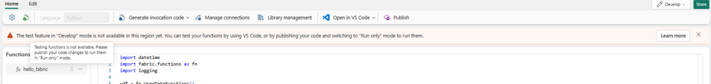 如果看到此信息性消息,仍可以发布函数并使用“运行”功能像以前一样测试它们。 若要详细了解如何在受支持的区域中创建新 容量,如何管理 Fabric 容量 。