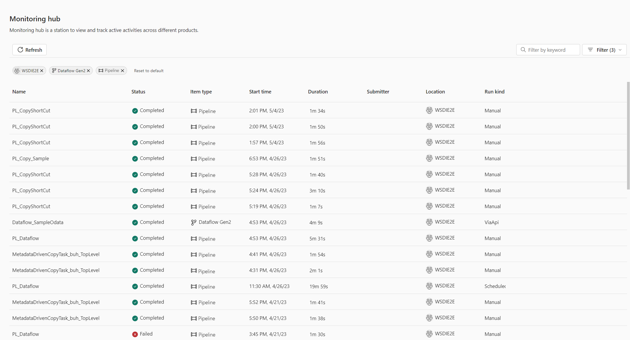 当您处于 数据工厂 或 数据工程 环境中时,监视中心充当集中式门户,便于浏览各项的管道运行。