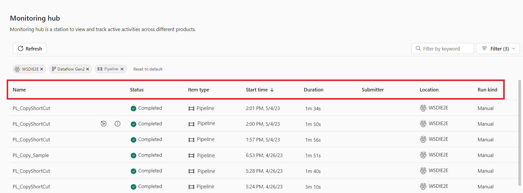 若要对管道运行进行排序,可以在每个列标题上选择,例如 “名称”、“ 状态”、“ 项类型”、“ 开始时间”、“ 位置 ”、“ 运行类型”等。