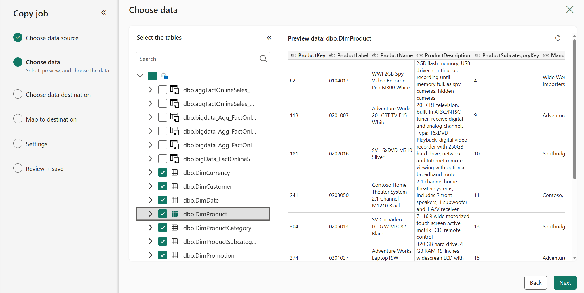 在“映射到目标”页面上,配置每个表的列映射。 选择“下一步”。