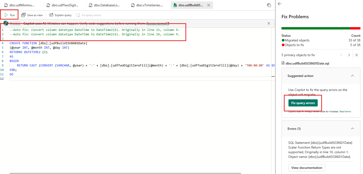 要使用 Copilot 获得 AI 支持的错误修复帮助,请选择“建议操作”部分中的“修复查询错误”。 Copilot 将提供脚本修复建议。 由于 Copilot 使用 AI,可能会出现错误,因此请验证代码建议并根据需要进行调整。