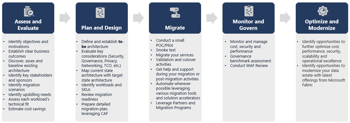 下图描述了迁移生命周期,其中列出了包括评估和评估、计划和设计、迁移、监视和管理、优化和现代化支柱在内的主要支柱,以及每个支柱中关联的任务,以规划和准备顺利迁移。