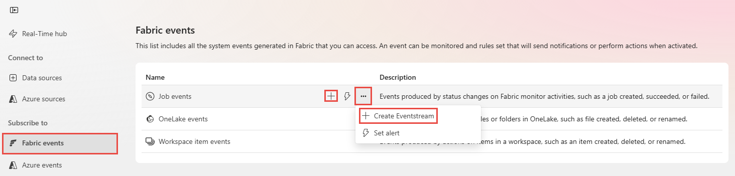 在实时中心,选择左侧菜单中的“Fabric 事件”。 可以使用 Fabric 事件的列表视图或作业事件的详细信息视图为作业事件创建事件流。