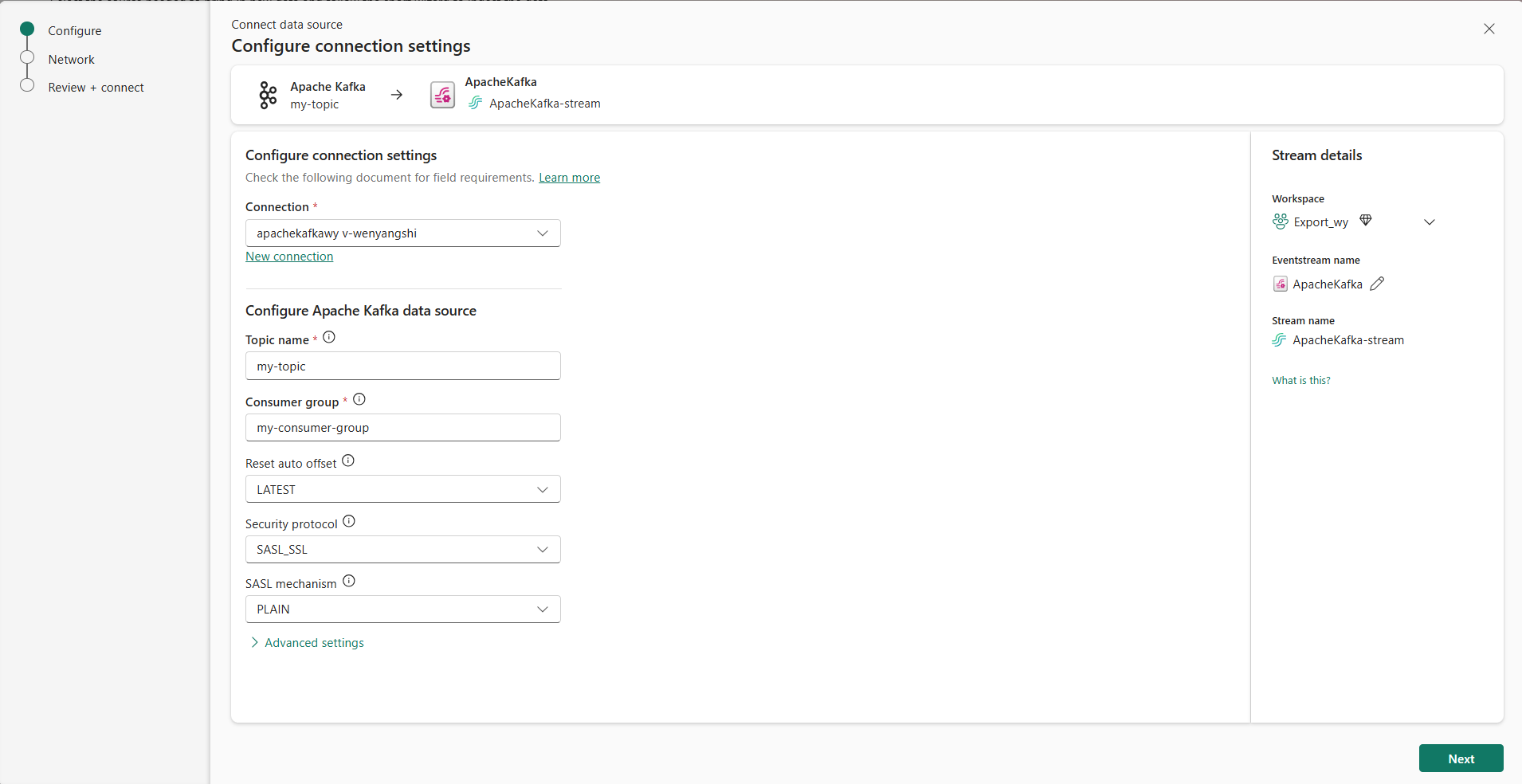 在 “连接凭据 ”部分中,如果有与 Apache Kafka 群集的现有连接,请从 “连接”下拉列表中选择它。 否则,请执行以下步骤: