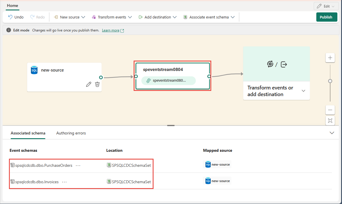 可以在“编辑模式”下看到添加到事件流的 Azure SQL 数据库 (CDC) 源。