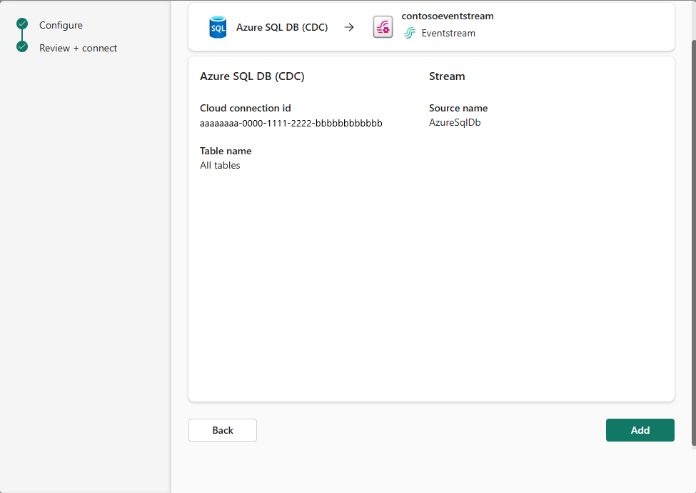 sys.sp_cdc_enable_db在 Azure SQL 数据库中启用了 CDC。 有关详细信息,请参阅启用和禁用变更数据捕获。 - 如果没有事件流,请创建一个事件流。
