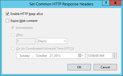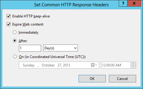 在“设置通用 HTTP 响应标头”对话框中,选中使 Web 内容过期的复选框,选择在特定时间间隔后过期或在特定时间过期的选项,然后单击“确定”。
