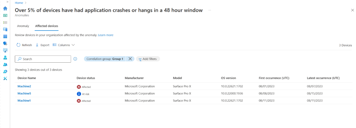 - 选择“ 查看受影响的设备” 以显示具有关键属性的设备列表。 筛选以查看特定相关组中的设备或显示受异常影响的所有设备。 设备时间线还会显示其他异常事件。