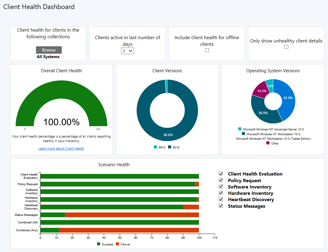 Configuration Manager提供了一个仪表板,其中包含有关环境中客户端运行状况的信息。 查看客户端运行状况、方案运行状况和常见错误。 按多个属性筛选视图,以查看 OS 和客户端版本出现的任何潜在问题。