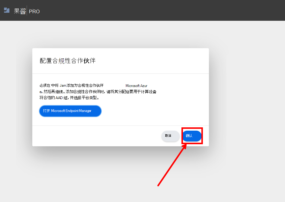 新的浏览器选项卡将打开一个带有 “配置合规性合作伙伴 ”对话框的 Jamf 门户页,然后选择标记为“ 打开Microsoft终结点管理器”的按钮。