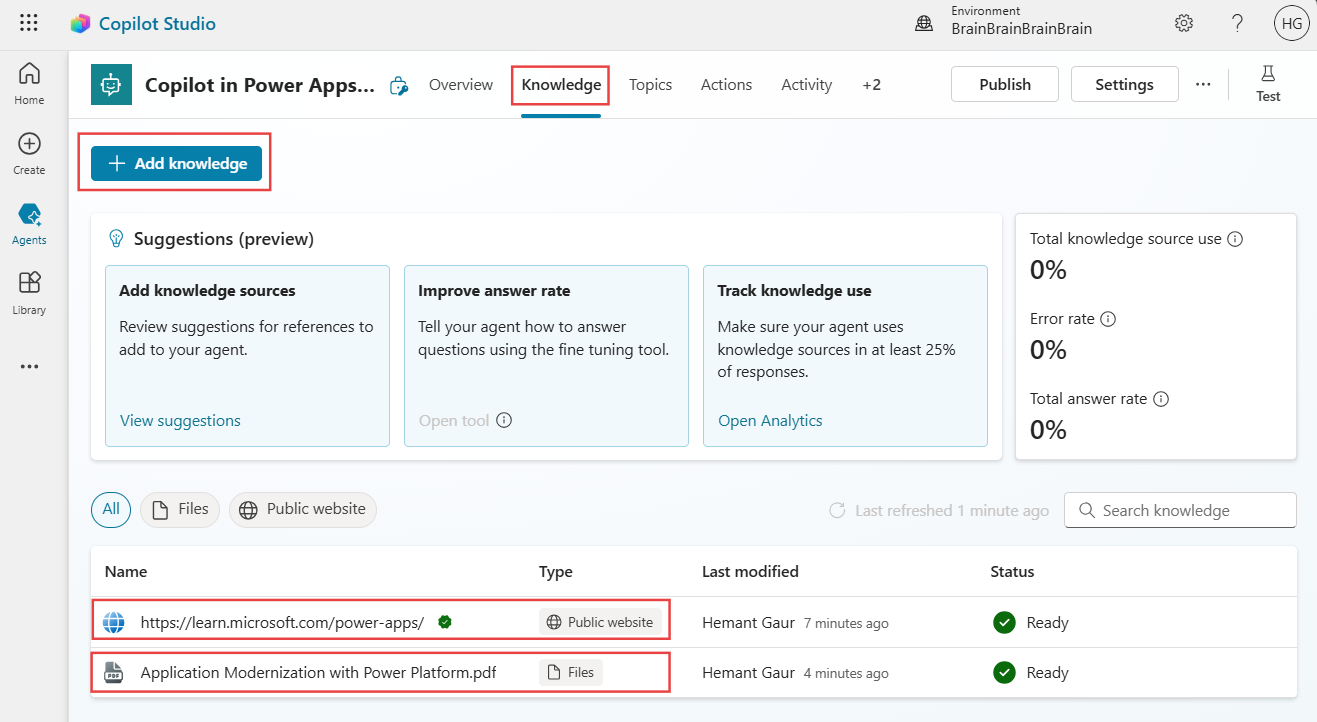 更多信息:为现有代理添加知识 - Microsoft Copilot Studio。