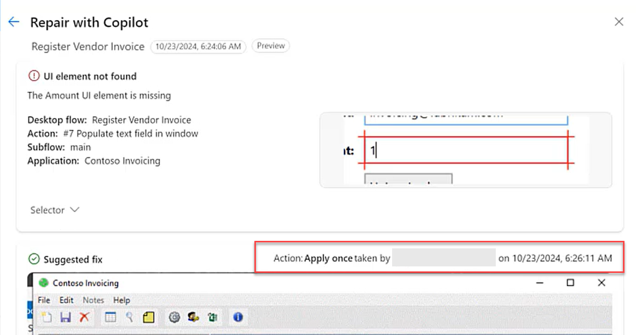 此功能使用 Copilot 在屏幕上查找和修复所需 UI 元素的选择器。 用户只需查看并批准 Copilot 的建议即可。 或者,用户可以在屏幕上手动指示 UI 元素,然后 Power Automate 桌面版可以相应地调整选择器。