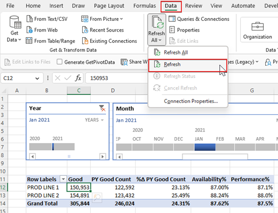 无论是 Excel 数据透视表还是表连接到 Power BI 语义模型,都可以通过刷新特定对象(数据透视表、数据透视图或表)或刷新连接到特定 Power BI 语义模型的所有对象来更新 Excel 工作簿中的数据。