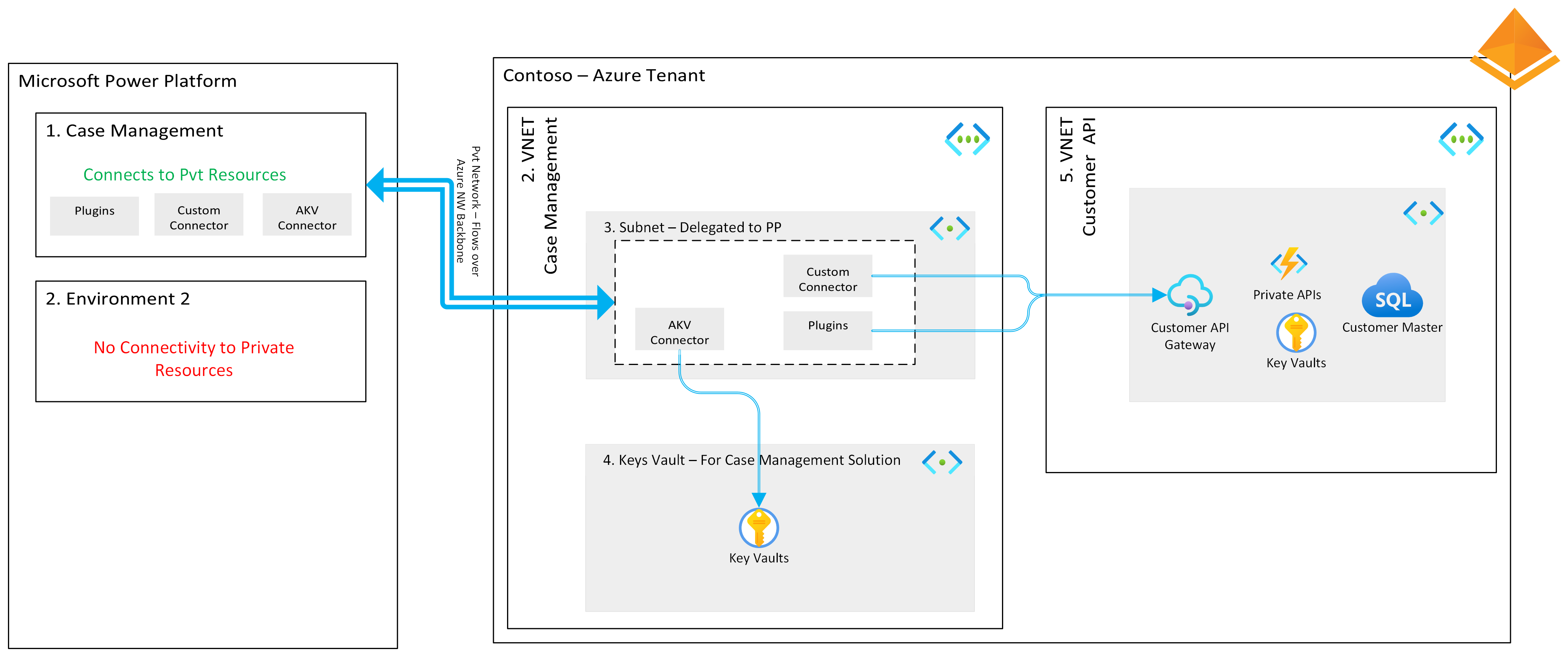 Azure 密钥保管库:存储使用 OAuth 连接后端 API 所需的凭证。 与后端 API 类似,Power Platform 资源通过虚拟网络访问 Azure 密钥保管库。