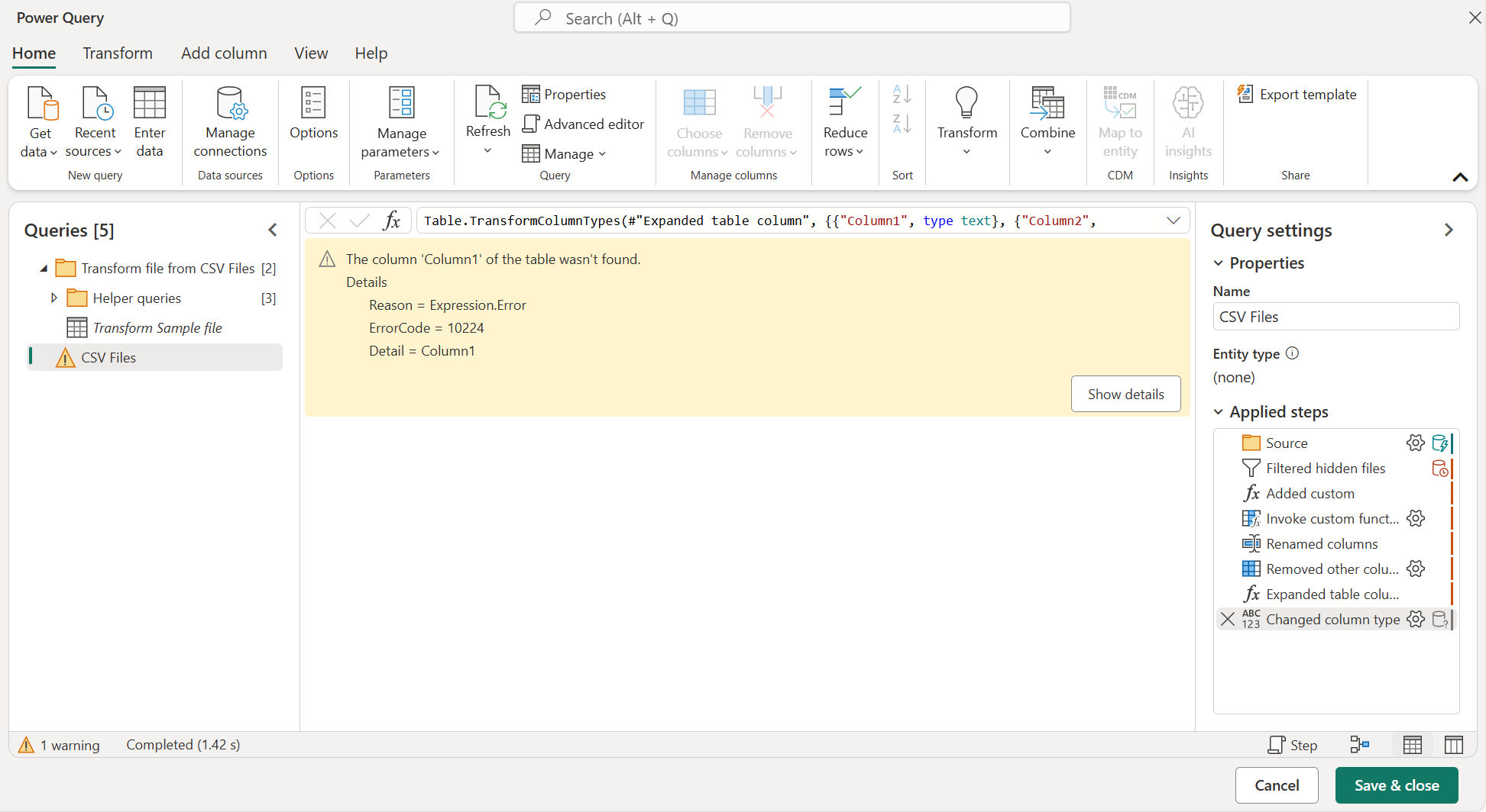 此错误背后的原因是,查询的上一个状态针对名为 Column1的列执行操作。 但由于 转换示例文件 查询所做的更改,此列不再存在。 详细信息:处理 Power Query 中的错误