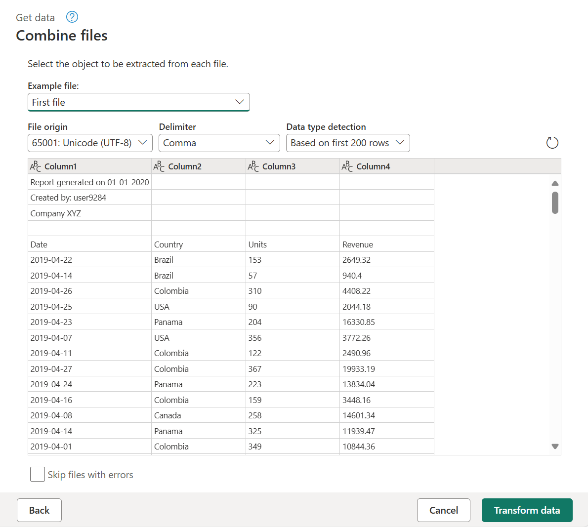 但是,数据的形状不正确。 在合并前,需要先从每个文件中删除前四行。 若要在合并文件之前在每个文件中进行此更改,请在屏幕左侧的“查询”窗格中选择 转换示例文件 查询。