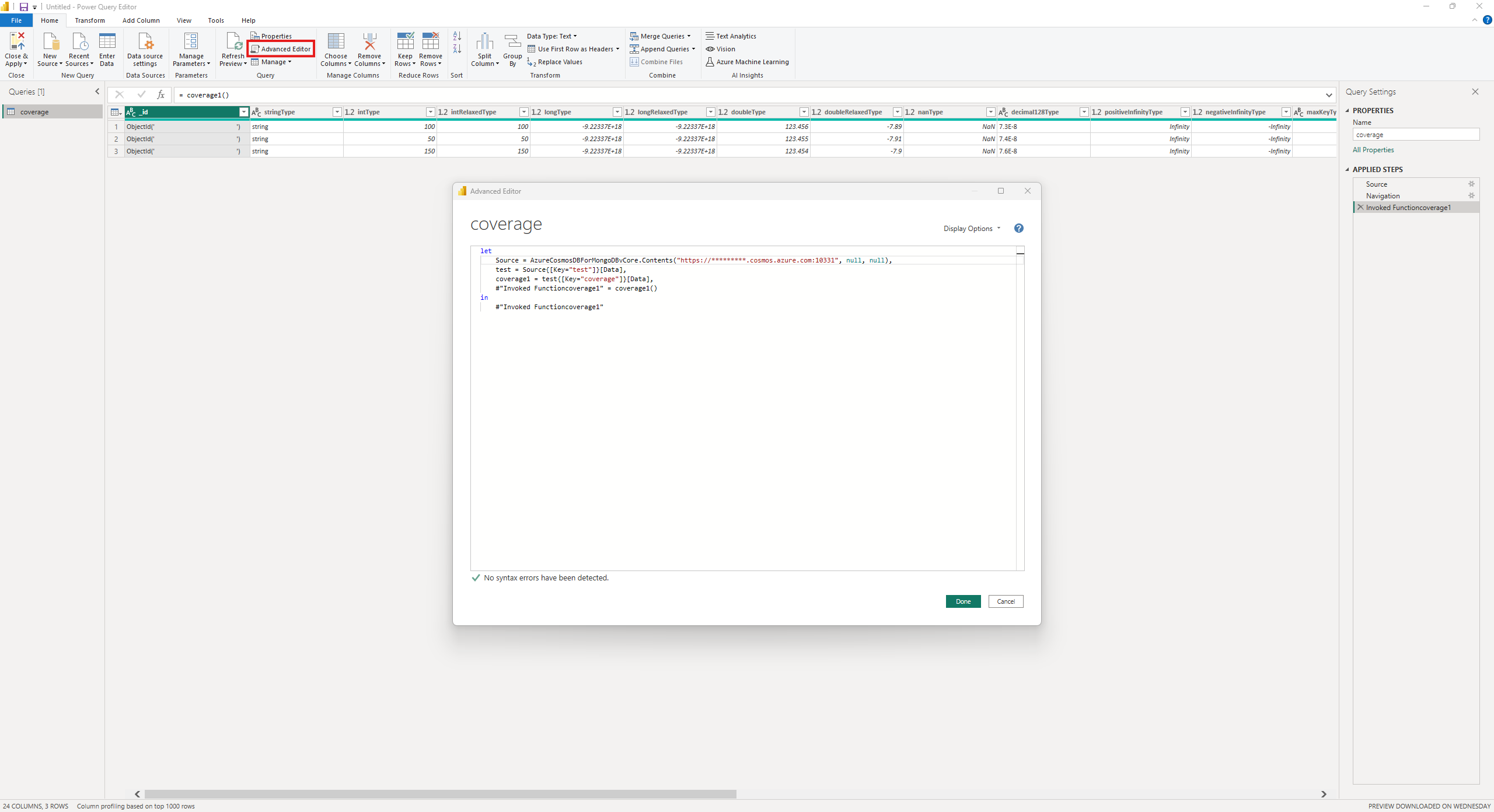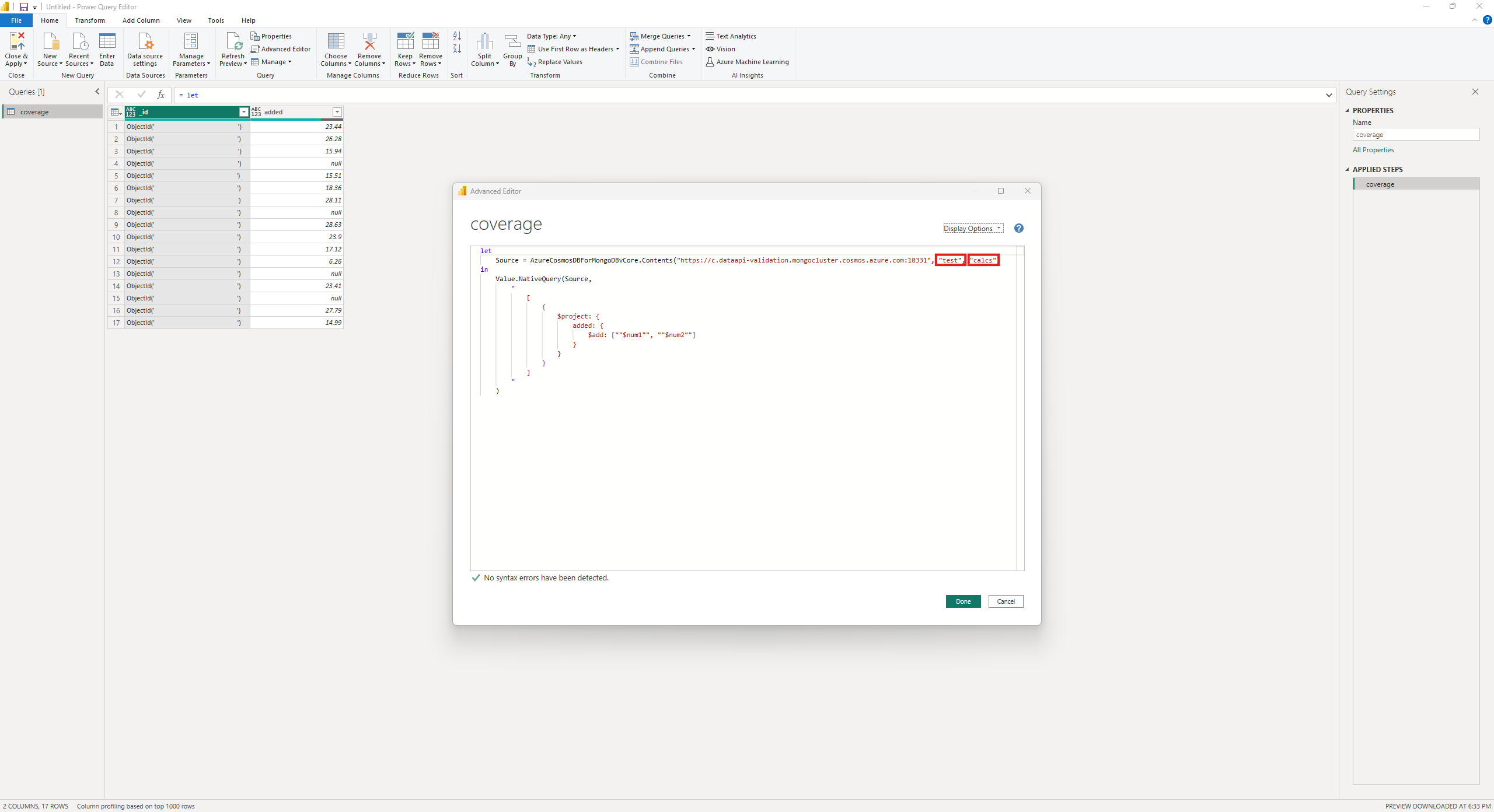 自定义 Value.NativeQuery 函数允许将本机 MongoDB 查询发送到数据源。 以下示例演示如何在最初加载数据时使用函数创建表。 但是,只要“转换数据”选项可用,就可以随时使用此功能。