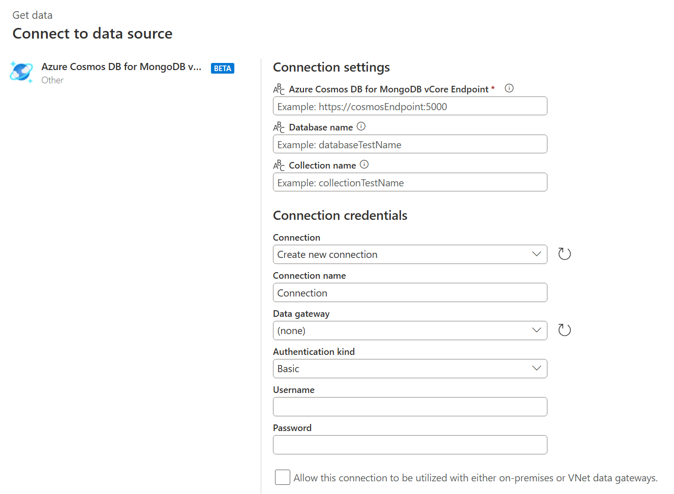 若要从 Power Query Online 连接到 Azure Cosmos DB for MongoDB vCore 数据库,请执行以下作: