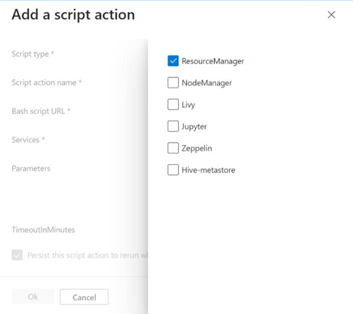 财产 描述 脚本动作名称 脚本动作的唯一名称。 Bash 脚本 URL 存储脚本的位置。 例如 - abfs://<CONTAINER>@<DATALAKESTOREACCOUNTNAME>.dfs.core.windows.net/<file_path>,更新 Data Lake 存储名称和文件路径。服务业 选择要在其中运行脚本作的特定服务组件。 参数 为脚本指定参数(如有必要)。 TimeOutInMinutes为每个脚本选择超时 注意事项