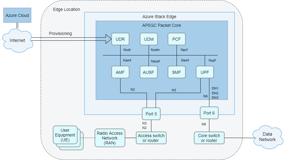 When deployed on Azure Stack Edge Pro GPU (ASE), AP5GC uses physical port 5 for access signaling and data (5G N2 and N3 reference points/4G S1 and S1-U reference points) and port 6 for core data (5G N6/4G SGi reference points).