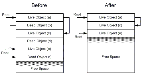 - 通过删除死对象并将活动对象向上滑动到堆的低地址端,定期压缩堆。 这会展开图表底部的未使用区域,在其中创建新对象。