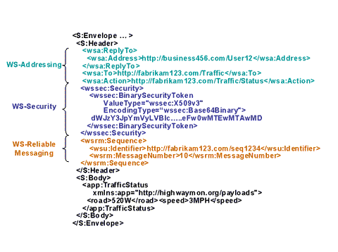 图 1 显示了一个简单的 Web 服务消息,其中包含用于 WS 寻址、WS-Security和 WS-ReliableMessaging的元素。 请注意,WS 寻址、WS-Security 和 WS-ReliableMessaging 元素是独立的,这些元素可以独立使用,而无需更改其他元素的处理。