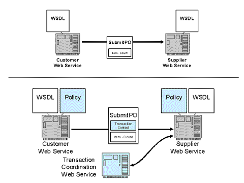 - 这些服务将 WS-Policy 文档,这些文档描述其对事务的支持与其服务的 WSDL 说明相关联。 请注意,这些策略声明会扩充,但不从根本上改变现有业务功能。