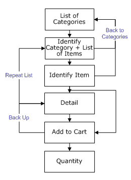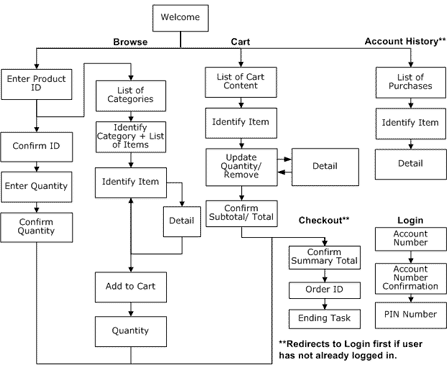 The design team found creation of a prompt specification document to be a challenge in itself. The number of paths available to the user at any one prompt leads to a complicated flowchart diagram that, while technically accurate, loses a sense of the conversation flow that the designers had worked to achieve. The design team arrived at a compromise specification that allowed them to illustrate an ideal scenario while also handling exceptions. The following example illustrates the beginning of the "Start Shopping" scenario from the main menu: