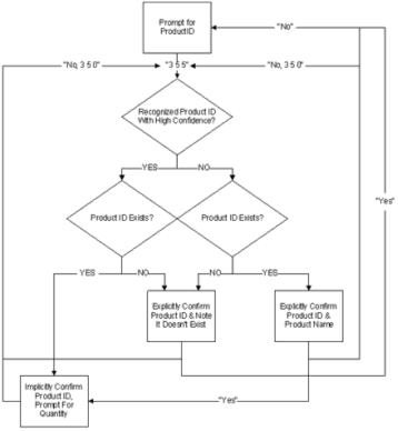 One of the more interesting navigational scenarios in the Commerce Application occurs when the user enters a product ID after saying "Start Shopping" from the main menu. We wanted to take advantage of the Speech Application SDK's "implicit confirmation" feature here: if the product ID is recognized with high confidence and the recognized ID exists in the system, we want to bypass the explicit confirmation of that prompt. A typical scenario might look like this (the complete flow diagram is represented on the right):