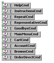 Commands fall into two categories: those that affect the current prompt (HelpCmd, InstructionsCmd, RepeatCmd), and those that trigger an event (RepresentativeCmd, GoodbyeCmd, and navigation commands like MainMenuCmd). For the former, the prompt function looks for a particular Type value in the History array parameter and creates an appropriate command. For the latter, the command's associated OnClientCommand event handler is executed.