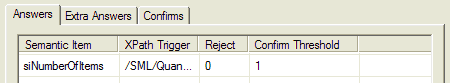 The NumberOfItemsConfirm QA confirms the siNumberOfItems semantic item set in the previous QA. Note that in the Answers tab of the NumberOfItemsQA, the Confirm Threshold for the siNumberOfItems semantic item is set to 1.