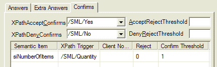 First, notice that the Confirms tab is used instead of the Answers tab. This tells RunSpeech to confirm the semantic items in the list. We use XPath to tell RunSpeech what to extract from the SML document that is returned from the grammar file. For a simple Yes/No confirm, all that is required is a grammar that returns yes or no. We also allow the user to also specify a new quantity by providing an XPath trigger for siNumberOfItems.