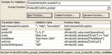 No object-references within prompt functions: Except for calls to PromptGenerator.js, we never make calls to script objects within the body of our prompt functions. Instead, our prompt function arguments are defined so that all function calls are made before the inner prompt function is executed. This avoids errors on validation that prevent prompts from appearing. Example: In the snapshot below, note the call to insertSpaces() in the productID variable declaration. A product ID ("355") must be separated into its component digits to be read correctly by recorded prompts. We make the call to the helper function that does this in the variable declaration and provide an already-formatted version of the productID ("3, 5, 5") as the validation value.
