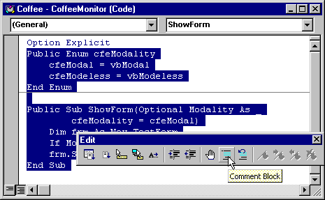 In the Project Explorer window, double-click CoffeeMonitor (or select it and then click the Code button on the Project Explorer window toolbar), to open its code window. Highlight all of the code except Option Explicit, and comment it out using the Comment Block button on the Edit toolbar, as shown here: