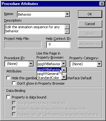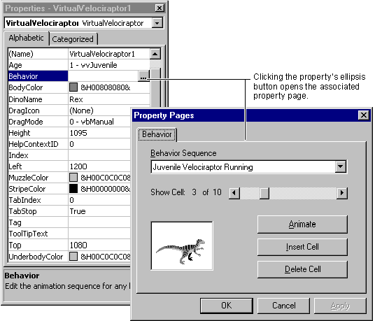 For example, Figure 10.3 shows how a property page might look for the Behavior property of a hypothetical VirtualVelociraptor control. This page allows cells to be added to and deleted from animation sequences for the control’s various behaviors.