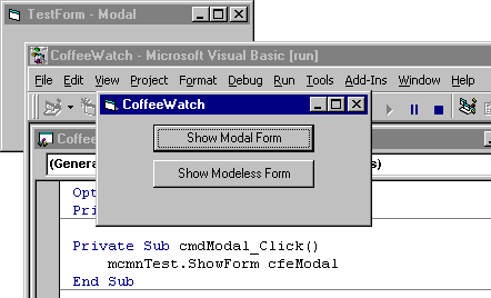 Note Depending on your system configuration and the order in which programs are loaded, the copy of Visual Basic in which Coffee is running may come to the front along with TestForm, obscuring CoffeeWatch.