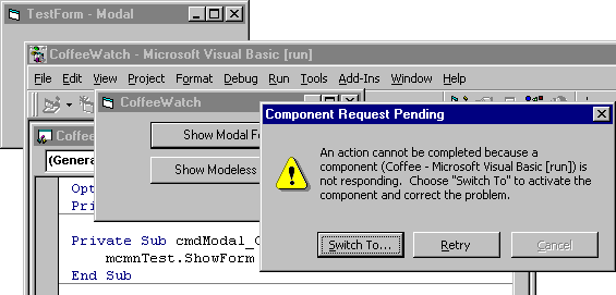 TestForm is not really modal with respect to the CoffeeWatch form. To see this, click anywhere on the CoffeeWatch form. The Component Request Pending dialog box appears, as shown here: