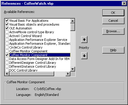 On the Project menu, click References to open the References dialog box. Check the entry for Coffee.vbp, as shown below, then click OK.