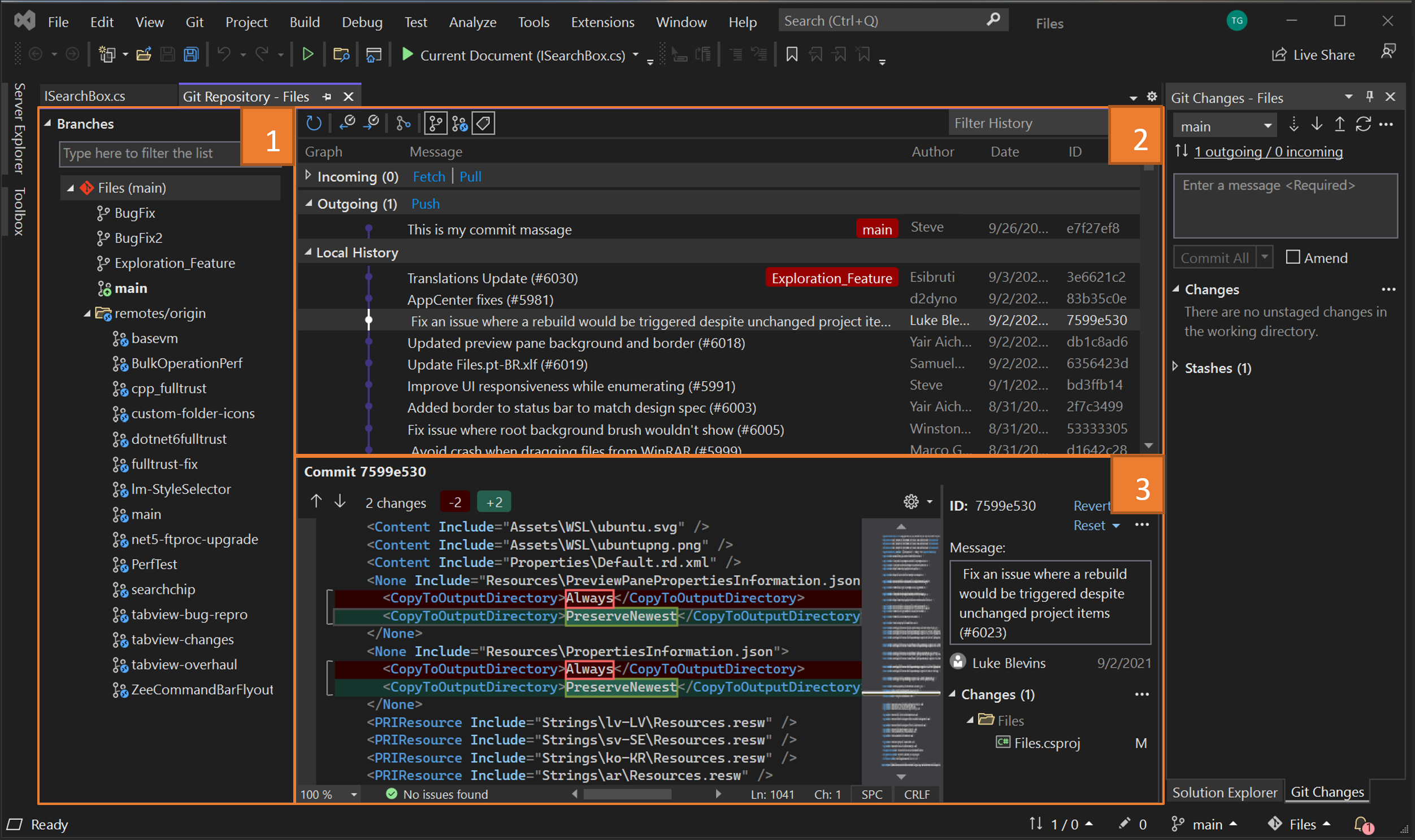 Commit: Selecting any commit in the Graph section opens its details. You can check the changes that a commit has introduced by selecting them, which shows a difference. For example, the previous screenshot shows the changes that one commit introduced to the Files.csproj file.