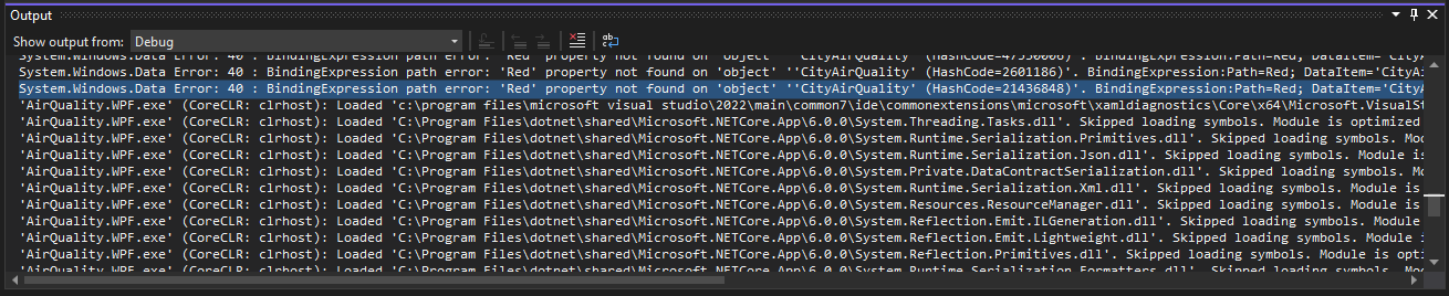 If the setting value is either Off or Critical, then data binding errors aren't written to debug output and can't be detected. With WPF in .NET 5, .NET 6, and later the data binding output setting doesn't affect the failure list.