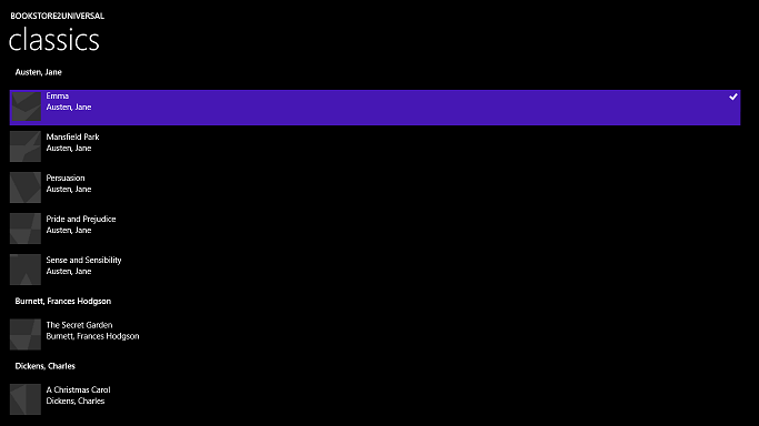 This case study, which builds on the info given in Bookstore1, begins with a Windows Phone Silverlight app that displays grouped data in a LongListSelector. In the view model, each instance of the class Author represents the group of the books written by that author, and in the LongListSelector we can either view the list of books grouped by author or we can zoom out to see a jump list of authors. The jump list affords much quicker navigation than scrolling through the list of books. We walk through the steps of porting the app to a Universal Windows app (using the Windows Runtime, or WinRT).