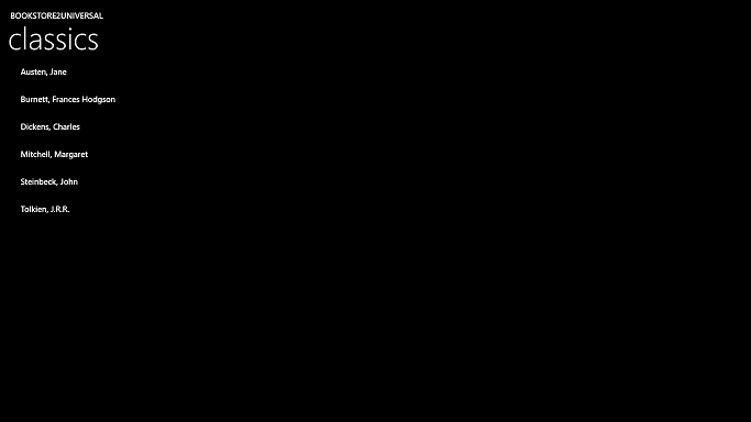 Lastly, in MainPage.xaml, refactor HeaderTextBlockStyle into the same two PageTitleTextBlockStyles that we arrived at in Bookstore1. That's all we need to do to get the Windows Store apps to build and run. Here's a first look at it:
