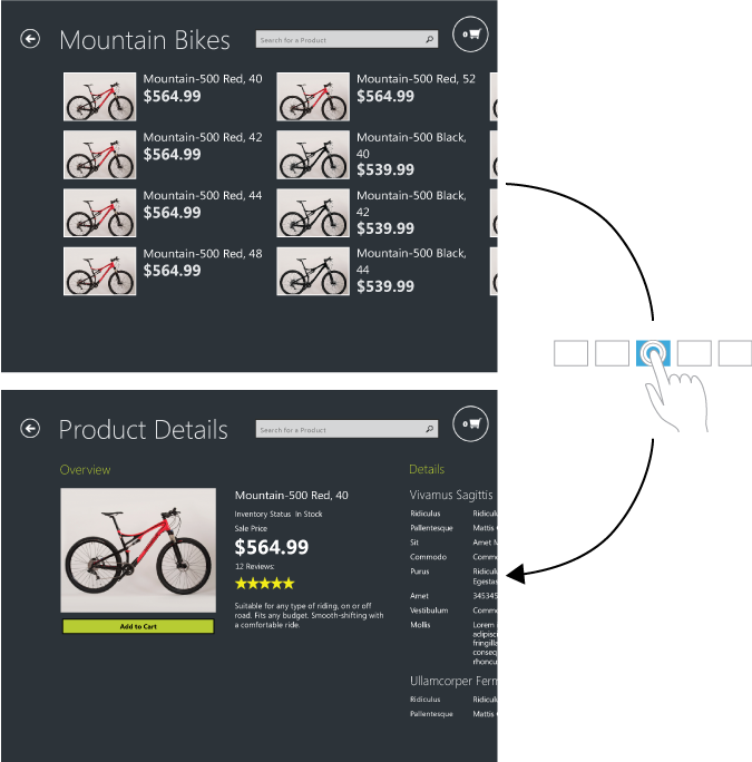 Tapping an element invokes its primary action. For example, on the GroupDetailPage, you tap on a product to navigate to the ItemDetailPage. The following diagram shows an example of the tap for primary action gesture in the AdventureWorks Shopper reference implementation.
