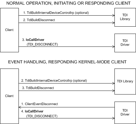 Disconnection behavior is transport-specific in nature. When a connection-oriented TDI client initiates a disconnect between nodes, both nodes might need to participate in the disconnection operation. That is, when one client initiates a disconnect, the remote-node client possibly must respond to it.