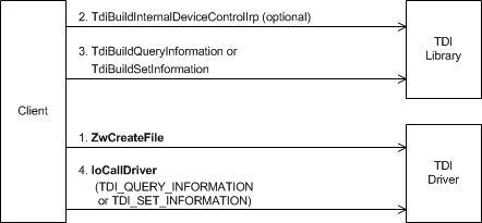 After its successful call to ZwCreateFile returns a file handle to the client and the client has obtained a pointer to the file object with ObReferenceObjectByHandle, it is ready to make certain types of TDI_QUERY_INFORMATION or TDI_QUERY_SET_INFORMATION IOCTL requests to its underlying transport.