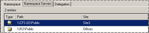 The contents of the details pane change according to what you have selected in the console tree. For example, if you select a namespace in the console tree, you see tabs named Namespace, Namespace Servers, Delegation, and Search in the details pane. If you select a replication group, you see tabs named Memberships, Connections, Replicated Folders, and Delegation. You can double-click objects in the details pane to view their properties.